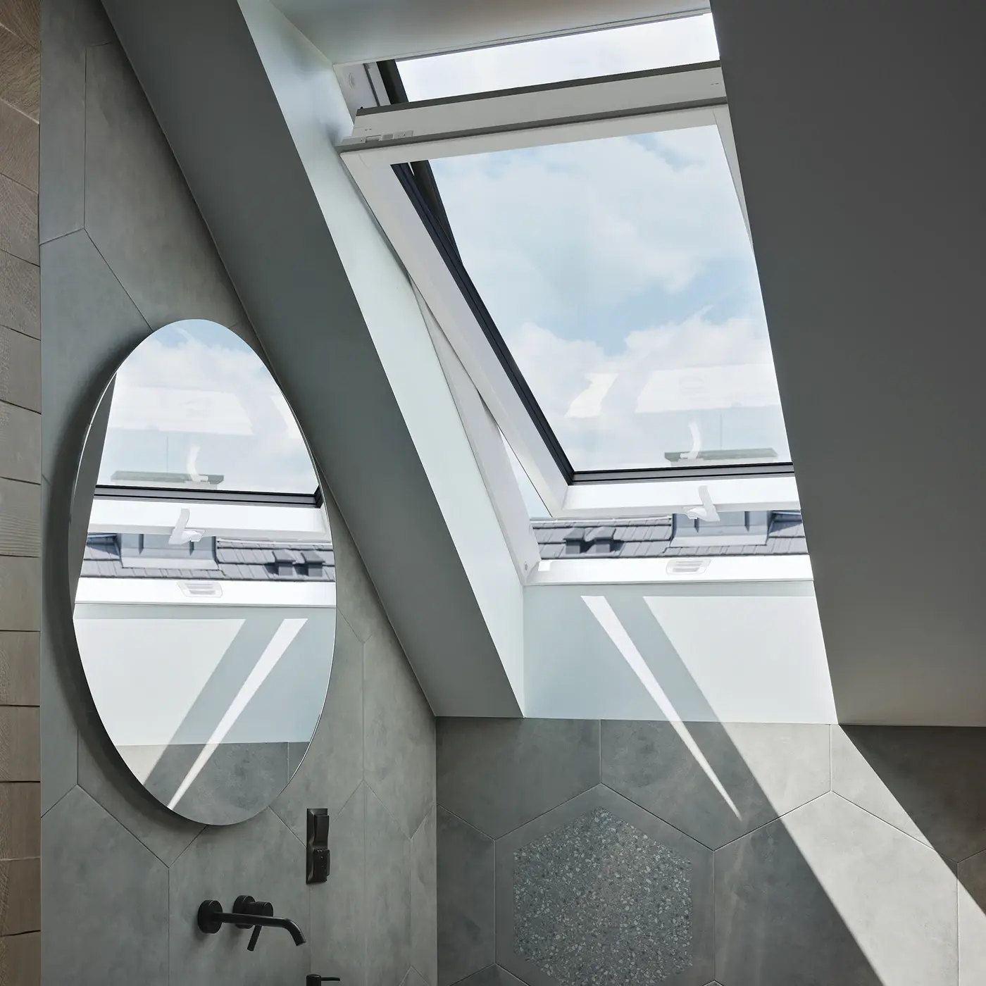 System obrotowego otwierania z zawiasem w połowie wysokości sprawia, że wietrzenie i mycie szyb jest proste i wygodne. Skrzydło porusza się płynnie i stabilnie, a precyzyjny mechanizm naprowadzający pozwala na lekkie i bezproblemowe zamykanie. Ergonomiczna klamka umożliwia intuicyjną obsługę, a blokada skrzydła w pozycji 180° pozwala bezpiecznie umyć zewnętrzną szybę od wewnątrz poddasza. To funkcjonalne rozwiązanie gwarantuje codzienny komfort użytkowania.