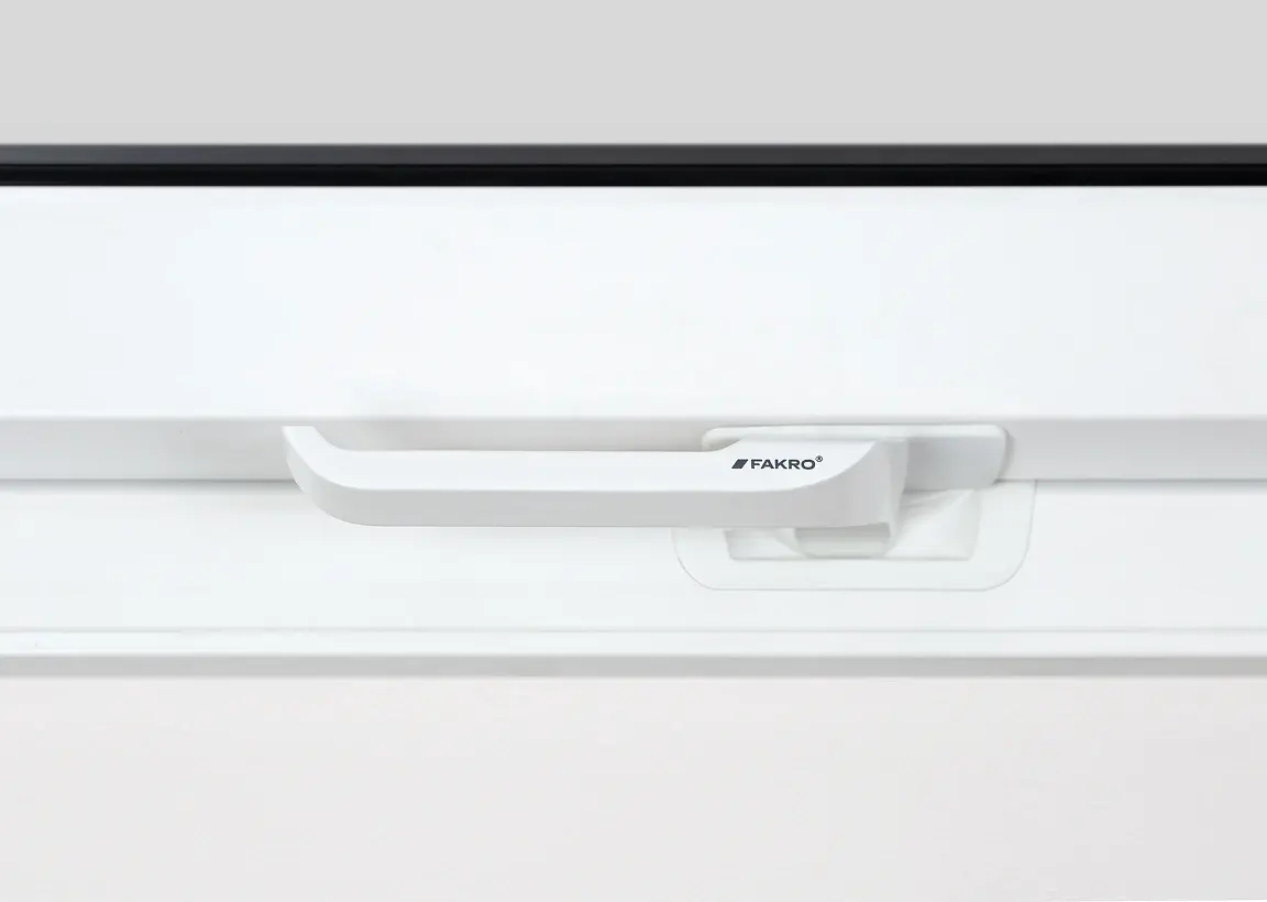 System obrotowego otwierania z zawiasem w połowie wysokości sprawia, że wietrzenie i mycie szyb jest proste i wygodne. Skrzydło porusza się płynnie i stabilnie, a precyzyjny mechanizm naprowadzający pozwala na lekkie i bezproblemowe zamykanie. Ergonomiczna klamka umożliwia intuicyjną obsługę, a blokada skrzydła w pozycji 180° pozwala bezpiecznie umyć zewnętrzną szybę od wewnątrz poddasza. To funkcjonalne rozwiązanie gwarantuje codzienny komfort użytkowania.